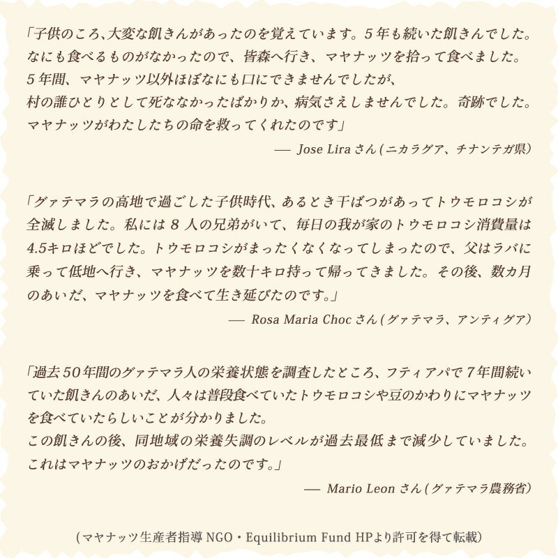 マヤナッツコーヒーを飲むことで、現地の貧しい人々に、現金収入を得る機会を提供し、またそれを加工する地方の女性に就労の機会を生み出すことができるのです。