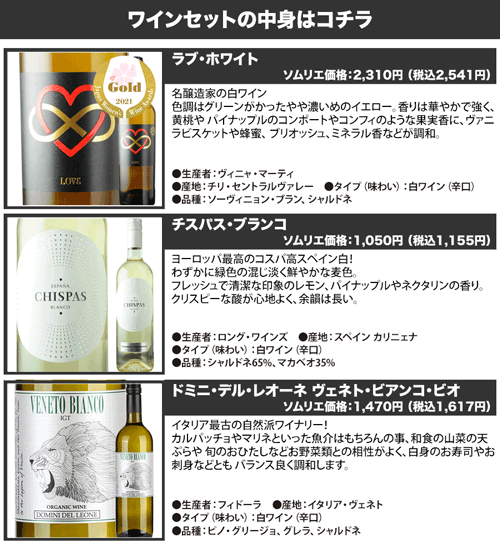 原産国 フランス / チリ / スペイン / イタリア / オーストラリア内容 ●ラブ・ホワイト / ヴィニャ・マーティ ●ムーアズクリーク・シャルドネ / ティレルズ・ワインズ ●チスパス・ブランコ / ロング・ワインズ ●ドミニ・デル・レオーネ・ヴェネト・ビアンコ・ビオ / フィドーラ ●パチャ・レゼルヴァ・ソーヴィニョン・ブラン / ヴィニャ・マーティ ●ドメーヌ・ド・ミセル / ドメーヌ・ド・ミセル内容量750mlタイプ白ワインご注意開封後は要冷蔵の上お早めにお飲みください。